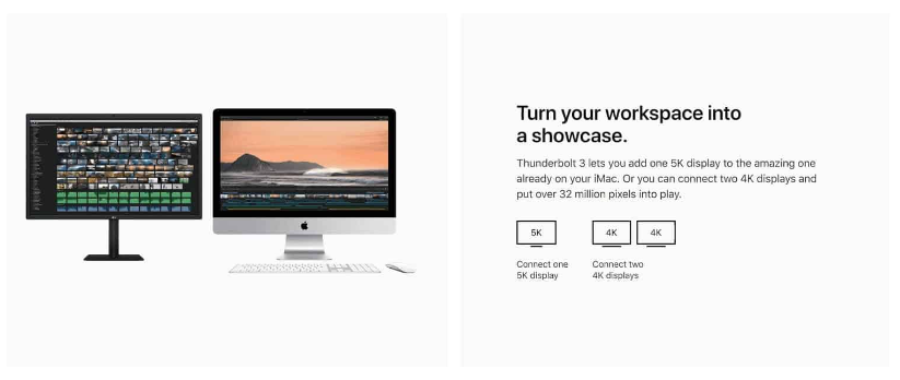 Tất cả các mẫu iMac đều được trang bị hai cổng Thunderbolt 3 có khả năng điều khiển một màn hình ngoài 5K ở 60Hz, hai màn hình 4K UHD ở 60Hz hoặc hai màn hình 4K ở 60Hz.