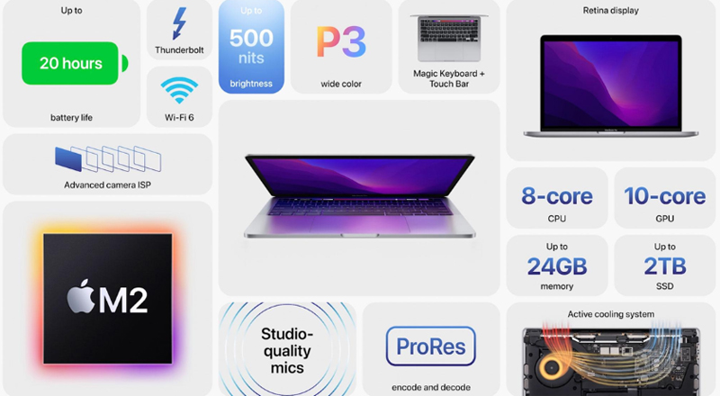 Tại Hội nghị dành cho các nhà phát triển thường niên của Apple được tổ chức vào 0h00 ngày 7/6 vừa qua (WWDC 2022), Apple đã giới thiệu chip M2 thế hệ thứ 2 cùng với MacBook Pro M2 (cũng như MacBook Air M2 được cập nhật). Tuy nhiên thiết bị không có nhiều thay đổi ngoài bộ vi xử lý M2 được nâng cấp.