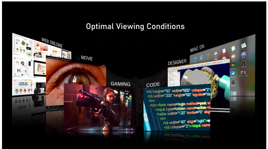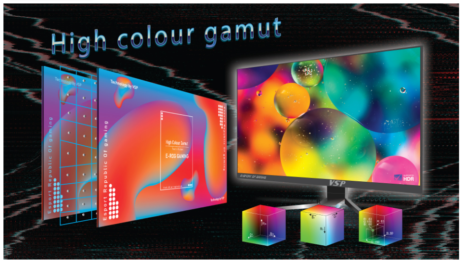 VG series Gaming được trang bị độ bao phủ màu dải màu sRGB, High colour gamut thể hiện màu sắc và kết cấu phong phú hơn. Độ bao phủ màu lớn cũng là một trong những điều kiện tiên quyết để một chiếc màn hình có thể cho lại trải nghiệm tốt khi chơi game và cug cấp một “không gian màu” đủ lớn khi làm việc. Với màn hình VG series Esport Republic Of Gaming được cường tăng màu sắc cải thiện độ chính xác của những màu mà màn hình mang lại.