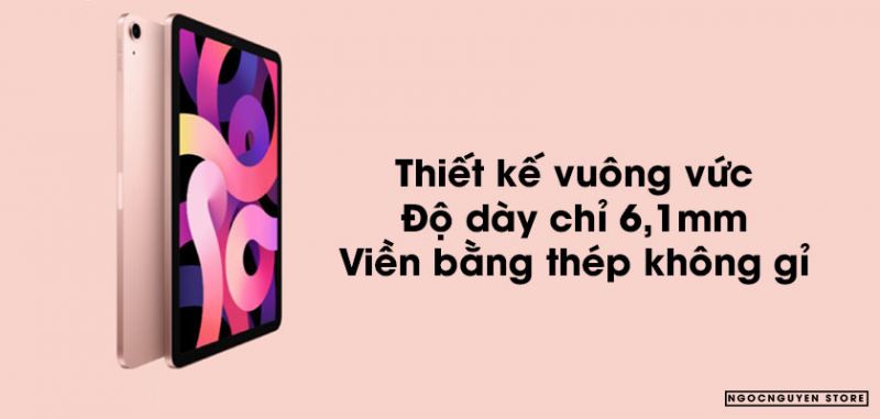 Apple iPad Air 10.9 2020 được thiết kế vuông vức giống như thiết kế của iPad Pro trong những năm qua. Viền màn hình của máy có thiết kế 4 cạnh đều nhau, và có cực mỏng với độ dày chỉ 6,1mm.