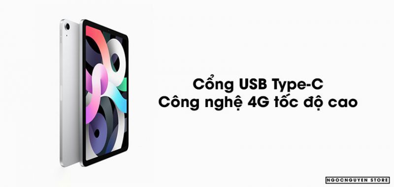 IPad Air 2020 còn sử dụng cổng USB Type-C, hỗ trợ sạc 20W và truyền dữ liệu tốc độ cao 5Gbps. Bên cạnh đó, công nghệ Wi-Fi 6 cũng được tích hợp trên máy và có cả tùy chọn LTE. Khả năng kết nối LTE trên iPad Air mới nhanh hơn 60% so với phiên bản trước đó.